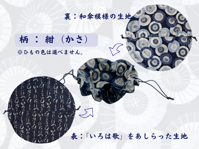 伊達な理由は「裏勝り」のデザインにあり!裏勝りは江戸時代に流行した文化です。幕府から奢侈(しゃし=贅沢)禁止令が出されても、おしゃれを楽しみたい江戸の人々が、着物の裏地に派手な色柄を施したのがはじまりです。裏表どちらでも使えるリバーシブルな巾着型の小物入れ袋になっています。