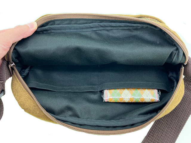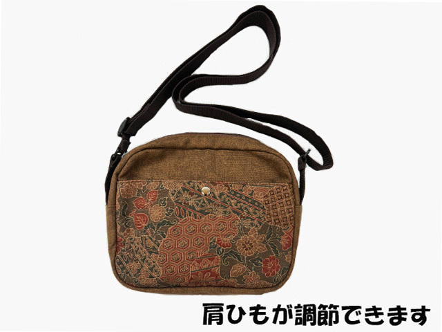 マチつきのショルダーバッグで、350mlのペットボトルを立てて入れられます。外側には、スマートフォンや定期券などの取り出しに便利なポケットが付いています。内側にもポケット付き。肩に食い込みにくい4㎝幅の肩ひもは、長さが調整可能です。生地の裁断、縫製、検査を刑務作業で行いました。